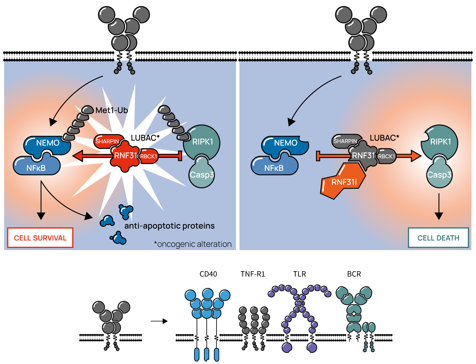 Oncogenic activation of LUBAC leads to aberrant hyperactivation of the TNFa, CD40, Toll-like receptors and B cell receptor instigated NF-kB pathways. Other than LUBAC, the NF-kB pathway members including CARD11, BCL10, A20 are often mutated, deleted or amplified in cancer.